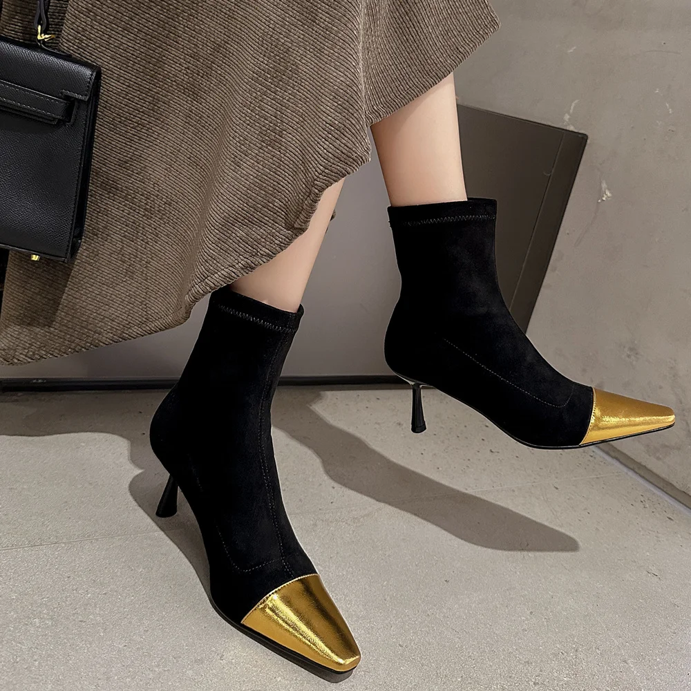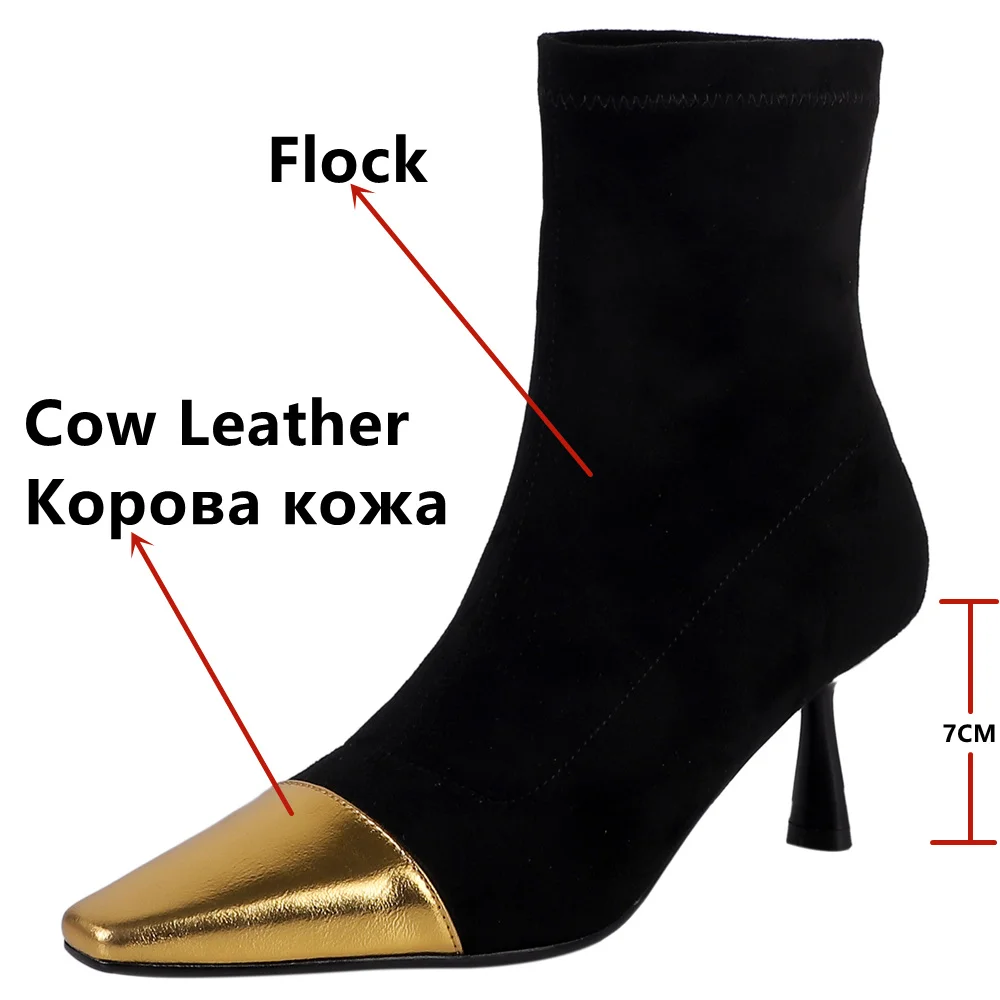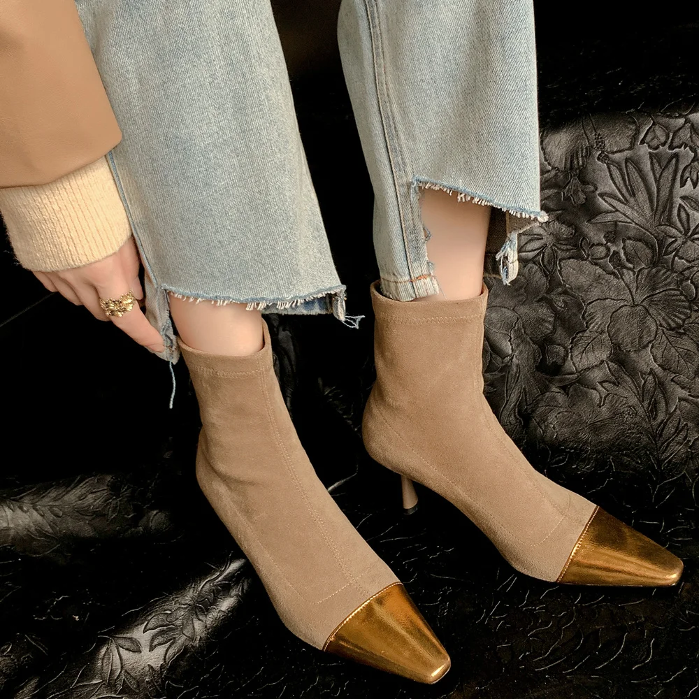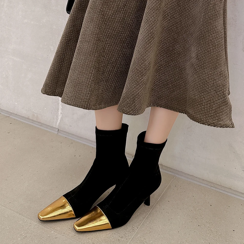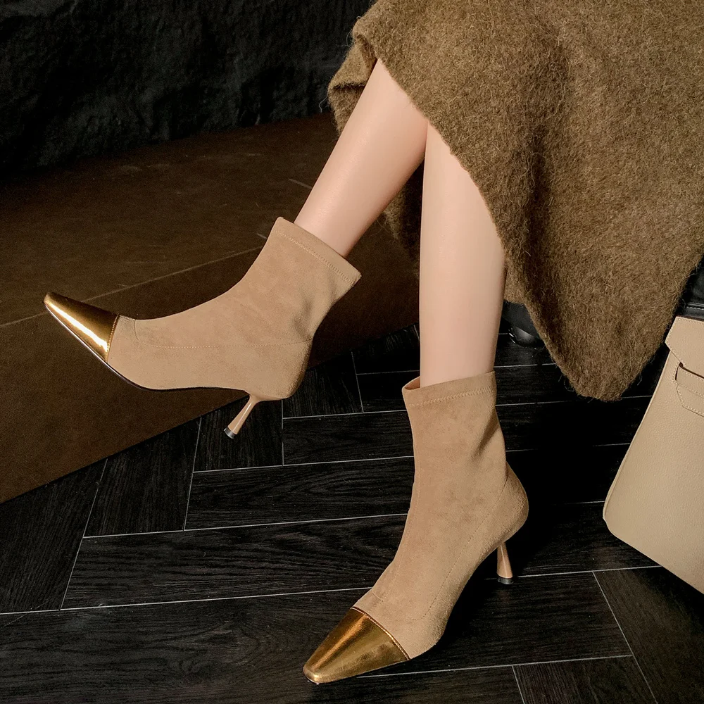 Mature Splicing Genuine Leather Women Ankle Boots Mixed Colors Office Ladies Thin High Heels Shoes Woman Autumn Winter