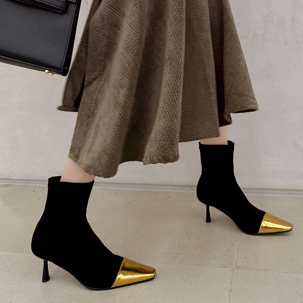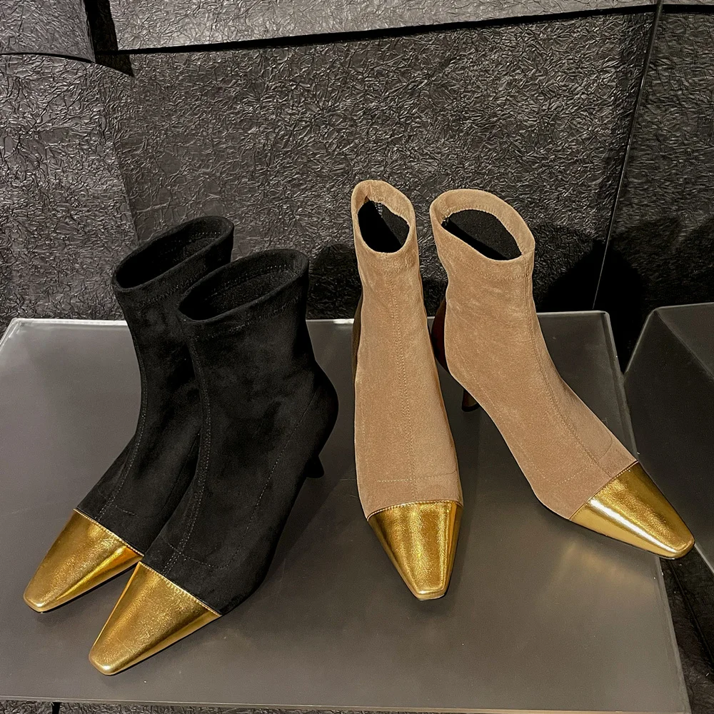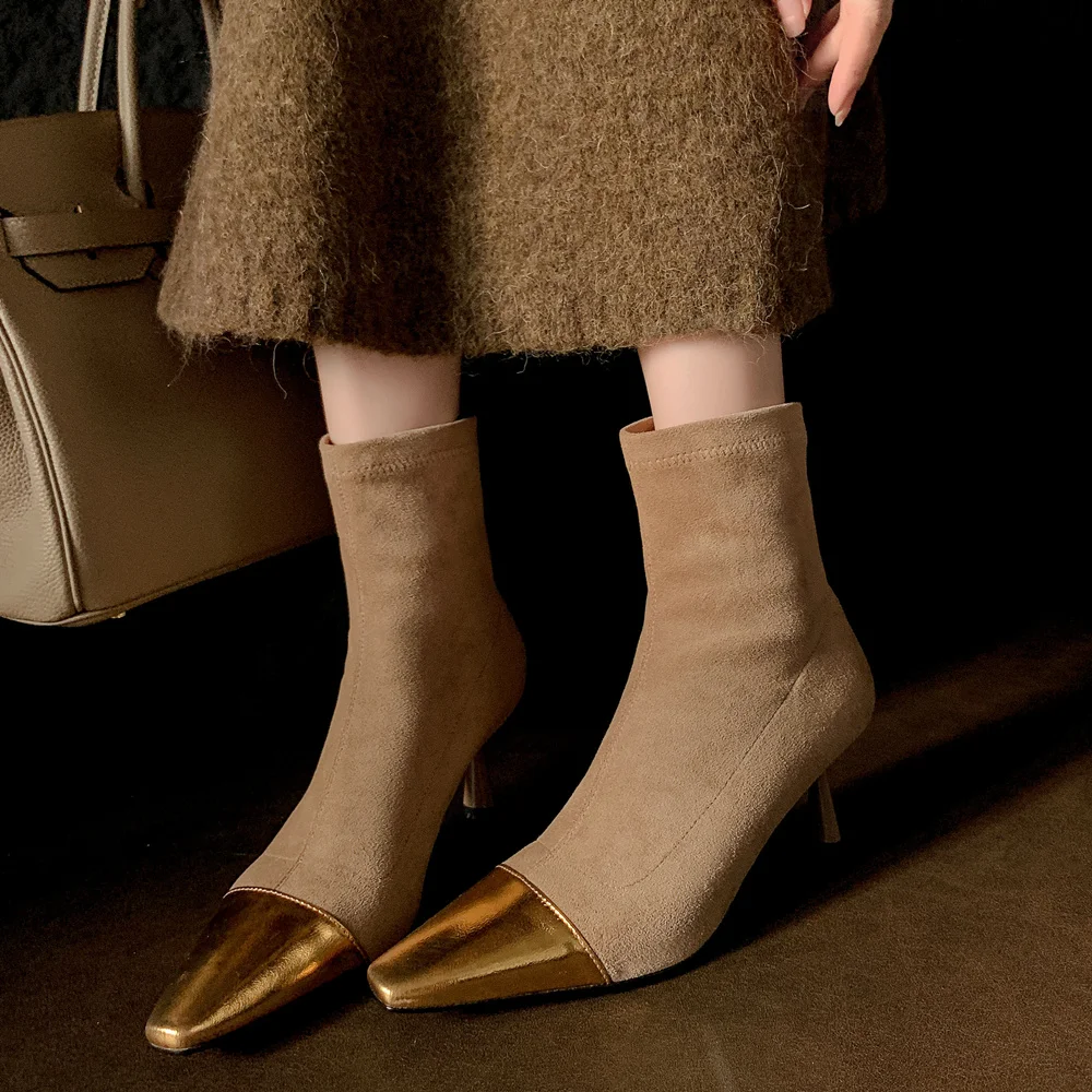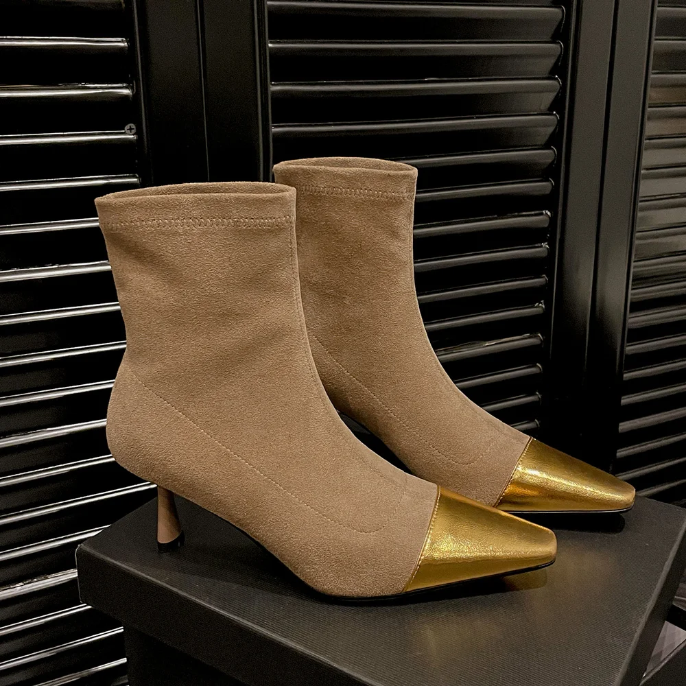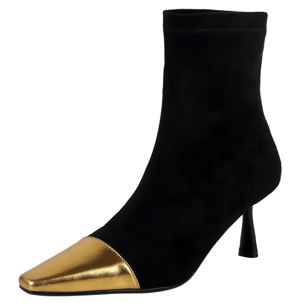 Mature Splicing Genuine Leather Women Ankle Boots Mixed Colors Office Ladies Thin High Heels Shoes Woman Autumn Winter