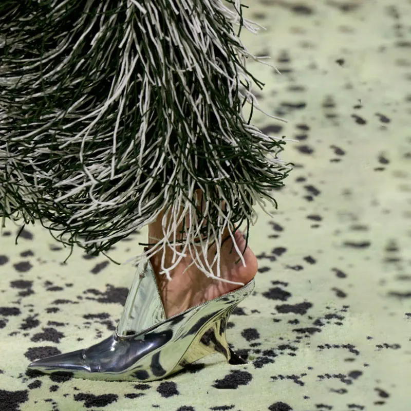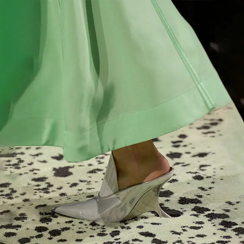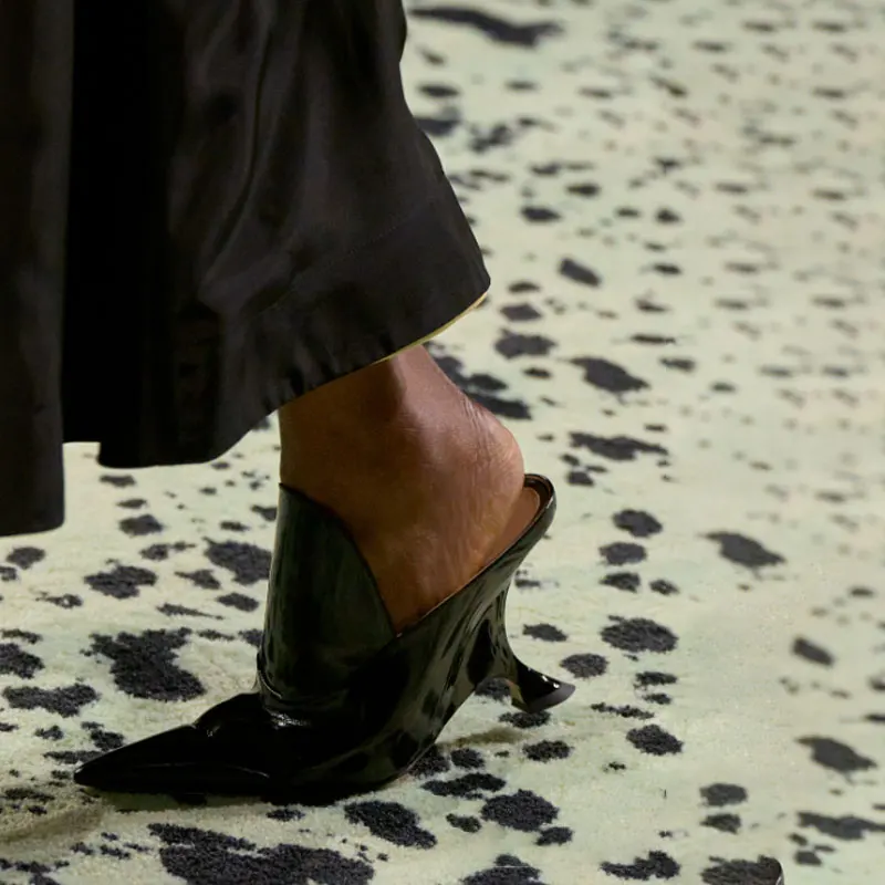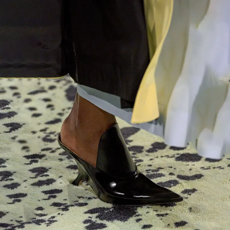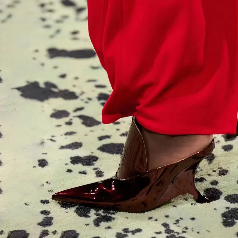 Pointed-Toe Glossed-Leather Stranger Wedge Heel Mules Slip-On Catwalk Cover Instep Design Women's Fashion Show Party Footwear